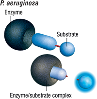 The test is based on a bacterial enzyme detection technology that signals the presence of P. aeruginosa through the hydrolysis of a substrate in the Pseudalert reagent. P. aeruginosa cells rapidly grow and reproduce using the rich supply of amino acids, vitamins, and other nutrients present in the Pseudalert reagent. Actively growing strains of P. aeruginosa have an enzyme that cleaves the substrate in the reagent to produce blue fluorescence under ultraviolet light