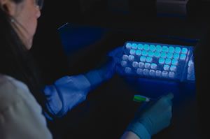 - Blue fluorescence of wells or vessel indicates a positive result.