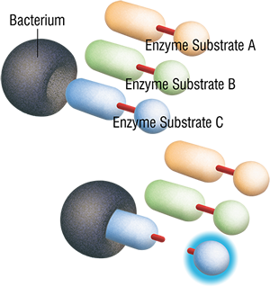 The test is based on the IDEXX proprietary Multiple Enzyme Technology, which detects viable heterotrophic organisms by testing for the presence of key enzymes known to be present in these organisms. The test uses multiple enzyme substrates that produce blue fluorescence when metabolized by waterborne bacteria.