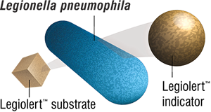 The Legiolert Test detects Legionella pneumophila in water samples. This test is based on a bacterial enzyme detection technology that signals the presence of Legionella pneumophila through utilization of a substrate present in the Legiolert reagent. Legionella pneumophila cells grow rapidly and reproduce using the rich supply of amino acids, vitamins, and other nutrients present in the Legiolert reagent. Actively growing strains of Legionella pneumophila use the added substrate to produce a brown color indicator. The Legiolert Test detects Legionella pneumophila at 1 organism in 100 mL within 7 days.